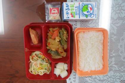 給食 豚肉のカレー炒め スパゲテイサラダ 鶏肉のバーベキュソース焼き 粉ふき芋