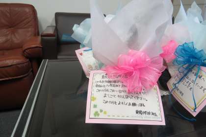 冬休みから育てたヒヤシンスと皆さんの心のこもったメッセージをステキな笑顔とともに届けることができました。