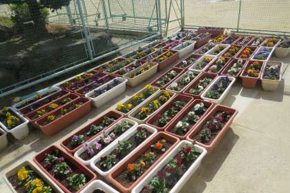 卒業式の花道にむけて、約50個のプランターのパンジーを育てています。