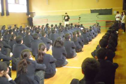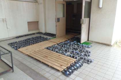 上履きのスリッパを入口のところにきっちりと並べています。また、早くから集合できている生徒は、気持ちを落ち着かせ、静かに待っています。