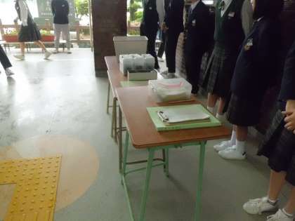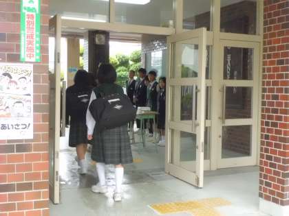 各学年の学級役員である風紀委員は、登校時に忘れ物(ネクタイ、リボン等)が無いように玄関のところに立っています。