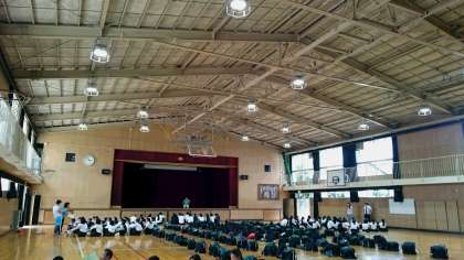 今日は5限目にクラスでしおりを使った説明、6限目に体育館で全体指導と各係の打合せを行いました。今年は休日明けの出発になりますので、忘れ物のないように準備をして、体調も万全に整えておいてください。74期生みんなで必ず一泊移住を成功させましょう。「心をひとつに」