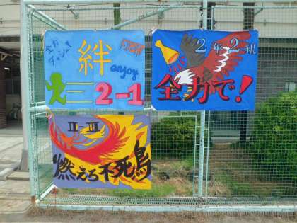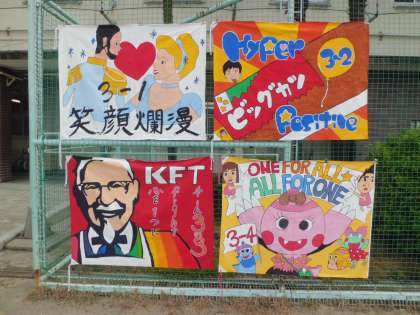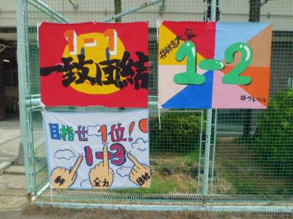 体育大会の行進や応援にふさわしい図案を、各学級が考え作成しました。