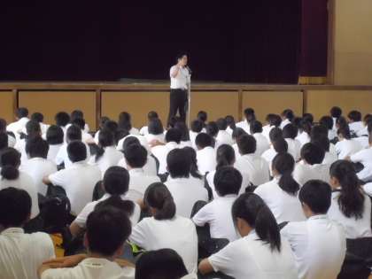 校長先生の話、そしてスクールサポーターと東成警察少年係の方からの夏休みの生活についての話、生徒指導主事の先生からの話と続きました。