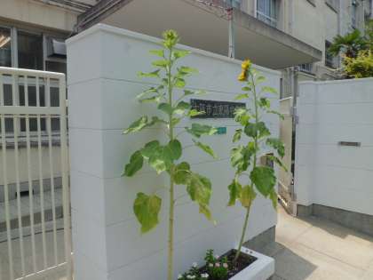 正門のところに植えている、ひまわりも日に日に大きくなり驚いています。花はしっかり太陽に向かって咲いています。