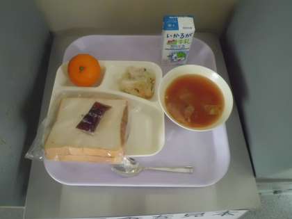 メニューは、豆乳マカロニグラタン(米粉)、トマトスープ、みかん(冷凍)、食パン、牛乳、いちごジャム です。