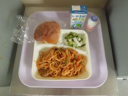 本日のメニューは、イタリアンスパゲティ、グリーンアスパラガスとキャベツのサラダ、発酵乳、黒糖パン、牛乳 です。
