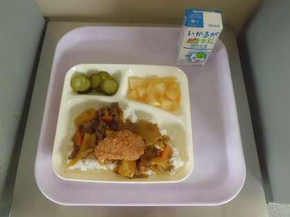 本日にメニューは、ビーフカレーライス[米粉]、一口ヒレカツ[米粉]、きゅうりのピクルス、白桃(カット缶)牛乳 です。