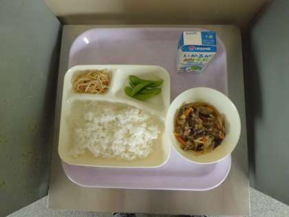 本日のメニューは、マーボなす、もやしのごま酢あえ、枝豆、ごはん、牛乳 です。