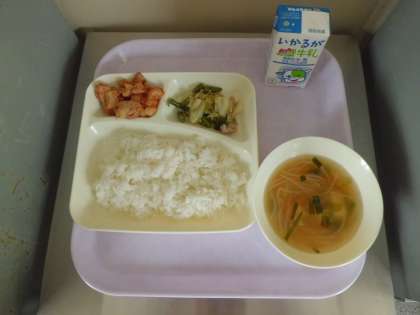 本日のメニューは、鶏肉のチリソース焼き、中華炒め、豆腐とワンタンの皮スープ、ごはん、牛乳 です。