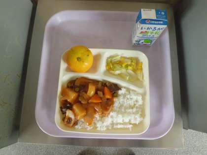 本日のメニューは、ハヤシライス[米粉]、キャベツとコーンのサラダ、みかん、牛乳 です。