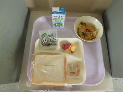 本日のメニューは、豚肉といかの中華煮、大学いも、ミニフィッシュ、食パン、アプリコットジャム、牛乳 です。