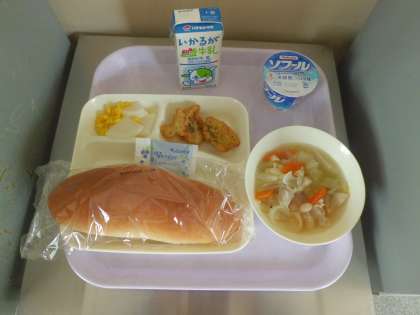 本日のメニューは、白身魚のフリッター、スープ煮、大根のピクルス、ヨーグルト、コッペパン、ブルーベリージャム、牛乳 です。