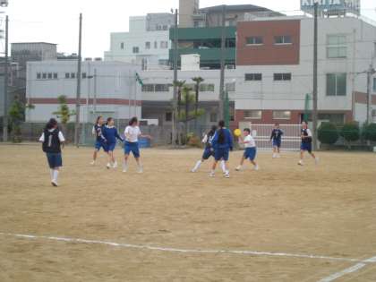 女子は運動場でゴール型球技「アルティメット」を行いました。