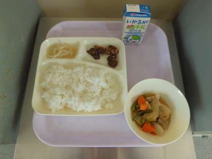 本日のメニューは、クジラの竜田揚げ、もやしのゆずの香あえ、さといもと野菜の煮物、ご飯、牛乳 です。