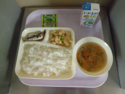 本日のメニューは、イワシの生姜煮、高野豆腐の卵とじ、うすくず汁、ご飯、牛乳、抹茶大豆(お茶めな大豆) です。