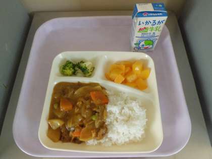 本日のメニューは、冬野菜のカレーライス、ブロッコリーのサラダ、黄桃[カット缶]、牛乳 です。