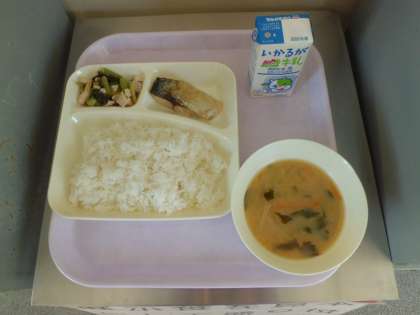本日のメニューは、さばのみぞれかけ、小松菜の煮びたし、ご飯、みそ汁、牛乳 です。