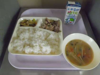 本日のメニューは、豚肉のごまだれ焼き、菊菜と白菜のおひたし、ご飯、みそ汁、牛乳 です。