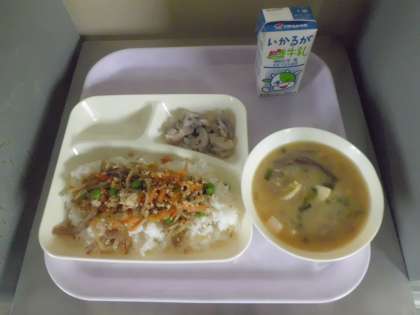 本日のメニューは、鶏ごぼうご飯、干しずいきのみそ汁、焼きレンコン、牛乳 です。
