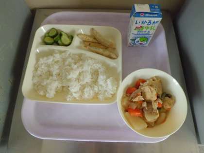 本日のメニューは、きびなごてんぷら、一口がんもと大根の煮物、あっさりきゅうり、ご飯、牛乳 です。