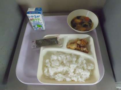本日のメニューは、揚げ鶏のねぎソースかけ、厚揚げと白菜の中華煮、焼きのり、ご飯、牛乳 です。
