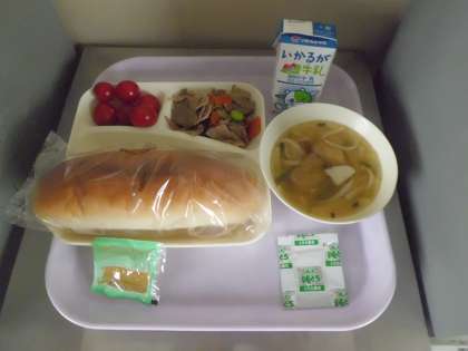 本日のメニューは、なにわうどん、とろろこんぶ、豚肉とごぼうの煮物、コッペパン、プチトマト、リンゴジャム、牛乳 です。
