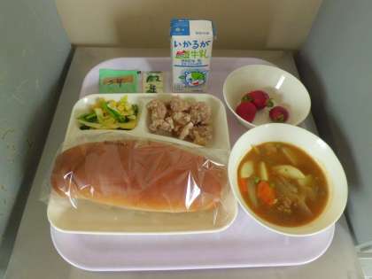 本日のメニューは、フライドチキン、カレーシチュー、春のカラフルソテー、黒糖パン、いちご、牛乳 です。