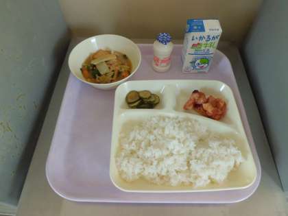 本日のメニューは、鶏肉のチリソース焼き、中華煮、きゅうりの中華あえ、ご飯、発酵乳、牛乳 です。