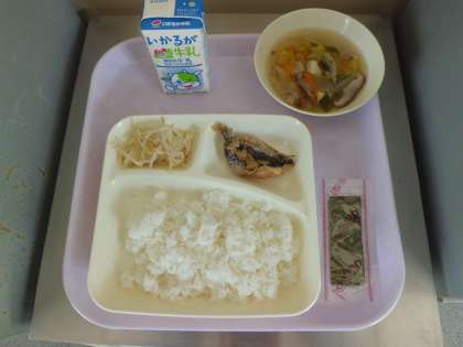 本日のメニューは、鰯のフライ、もやしの生姜醤油かけ、五目汁、焼きのり、ご飯、牛乳 です。