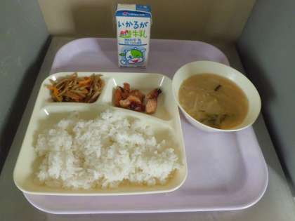 本日のメニューは、鶏肉の照り焼き、きんぴらごぼう、さつまいものみそ汁、ご飯、牛乳 です。
