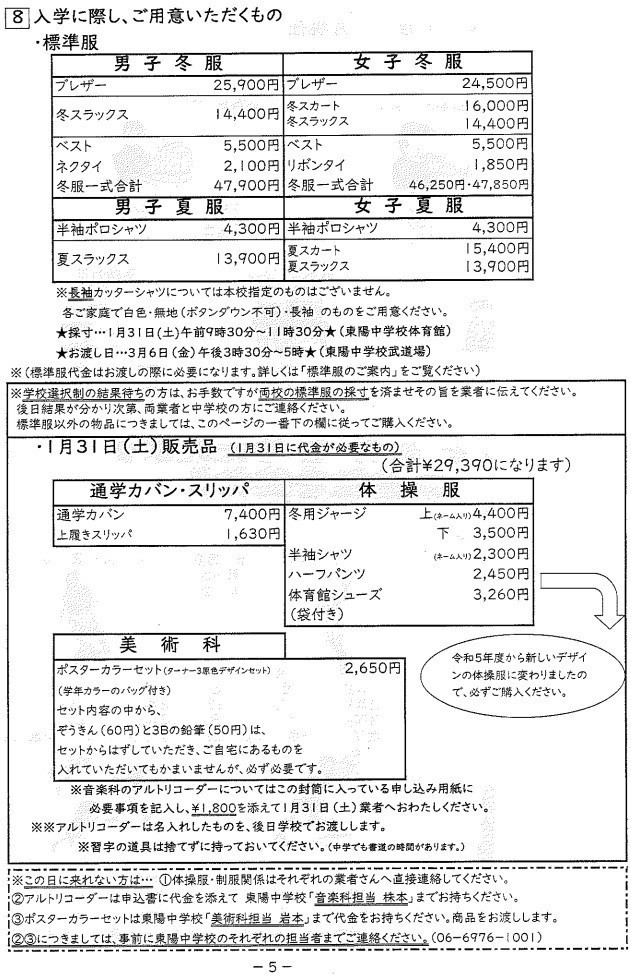 内容:制服採寸 及び 物品販売 (通学カバン・スリッパ・体操服・体育館シューズ・ポスターカラーセット)