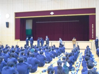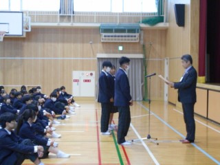 全校集会において東成区長 春木 卓伸(はるき たかのぶ)区長から全国・体力運動能力テストの東成区成績優秀者に対して表彰して頂きました。