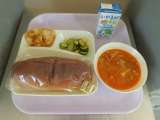 本日のメニューは、豚肉と野菜のケチャップ煮、きゅうりとコーンのサラダ、黒糖パン...