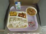 本日のメニューは、豚肉のごまだれ焼き、菊菜と白菜のおひたし、ご飯、みそ汁、牛乳...