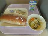 本日のメニューは、鶏肉と野菜の洋風煮、ブロッコリーのサラダ、食パン、リンゴ、牛...