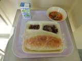 本日のメニューは、牛肉の香味焼き、ケチャップ煮、うずら豆のグラッセ、おさつパン...