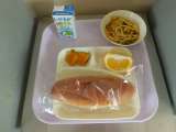 本日のメニューは、カレースパゲティ、焼きかぼちゃ、黒糖パン、あまなつかん、牛乳...