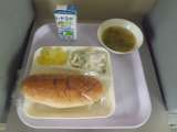 本日のメニューは、マカロニグラタン、レタスのスープ、おさつパン、リンゴ(カット...