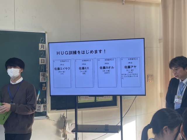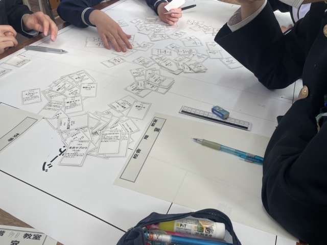 - 3年生は教室で班ごとに分かれ、HUG訓練(避難所運営ゲーム)を実施しました。