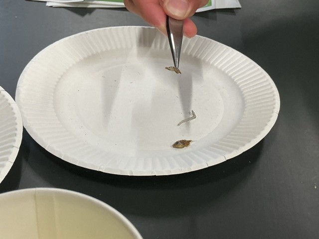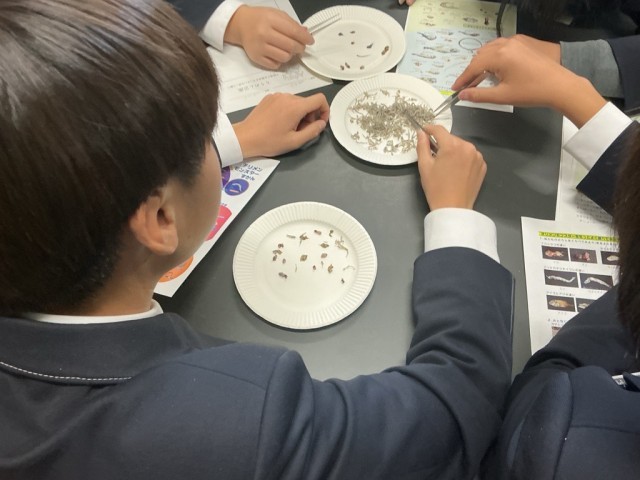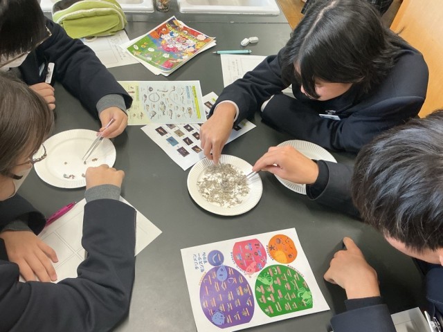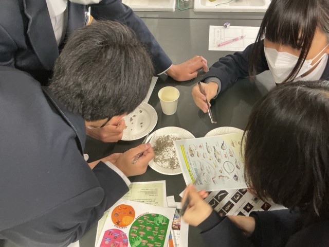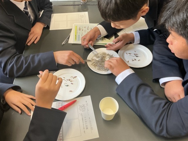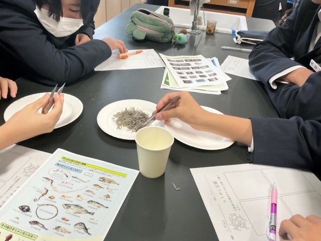 生徒たちは、ちりめんじゃこに混ざって入っている小さな生き物――通称「ちりめんモンスター」を探しながら、大阪湾に生息する多様な生き物について学びました。