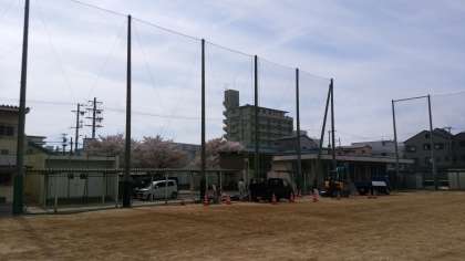 グラウンドを仕切る準備と水道工事の業者の方が入っています。