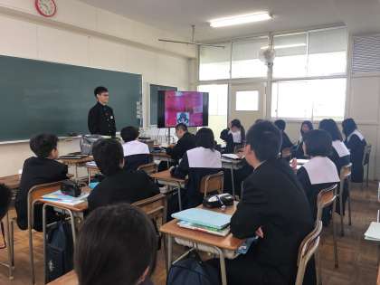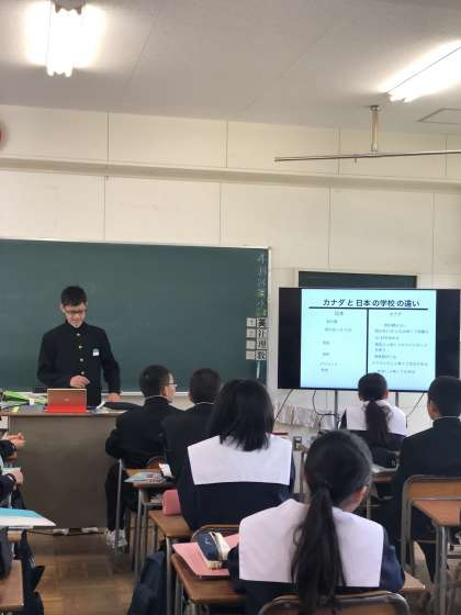 教科書や掃除が無いカナダの学校の様子など、日本との違いをクラスの皆に話してくれています。