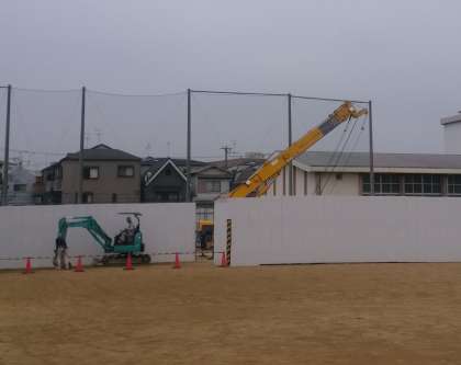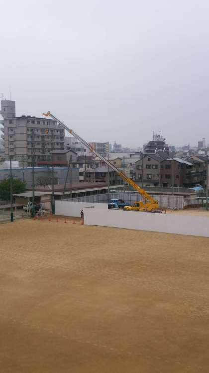 今日は体育館工事の為に囲われ他グラウンド部分に鉄板を敷く作業に入ります。大きなダンプカーなどが行き来するので、グラウンドの保護を目的とするそうです。
