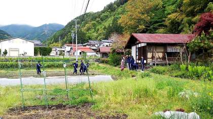 昨夜お世話になった民家の方と、農業体験をしています。