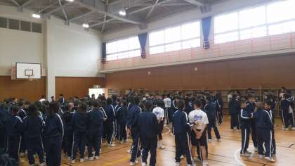バスの時間を待っていますが、体育館でレクリエーションをしています。