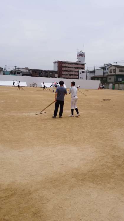 まずは、整地から。校長先生も自らトンボを持ちます。