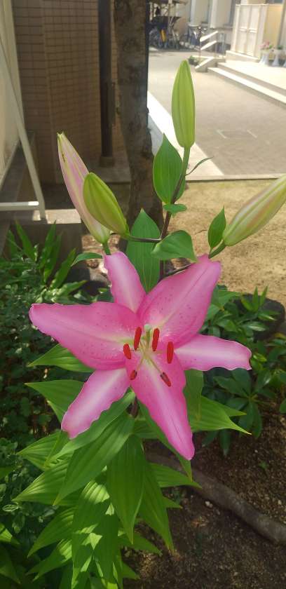学校北側、玄関のすぐ西側に大きなユリが咲いています。