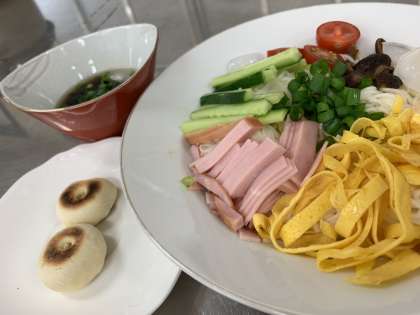 家庭科部の調理実習です。今日はそうめんと豆腐入りプチ焼きドーナツを作りました。干ししいたけと鰹の出汁で手づくりしたそうめんつゆはとても美味しかったです。
