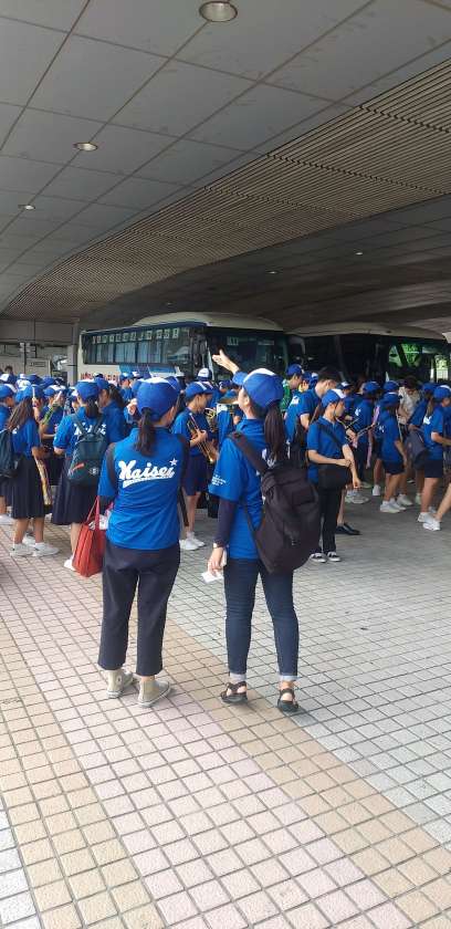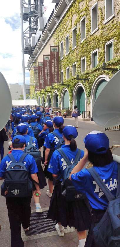阪神甲子園に到着し、楽器を受け取りアルプス席へと向かっています。